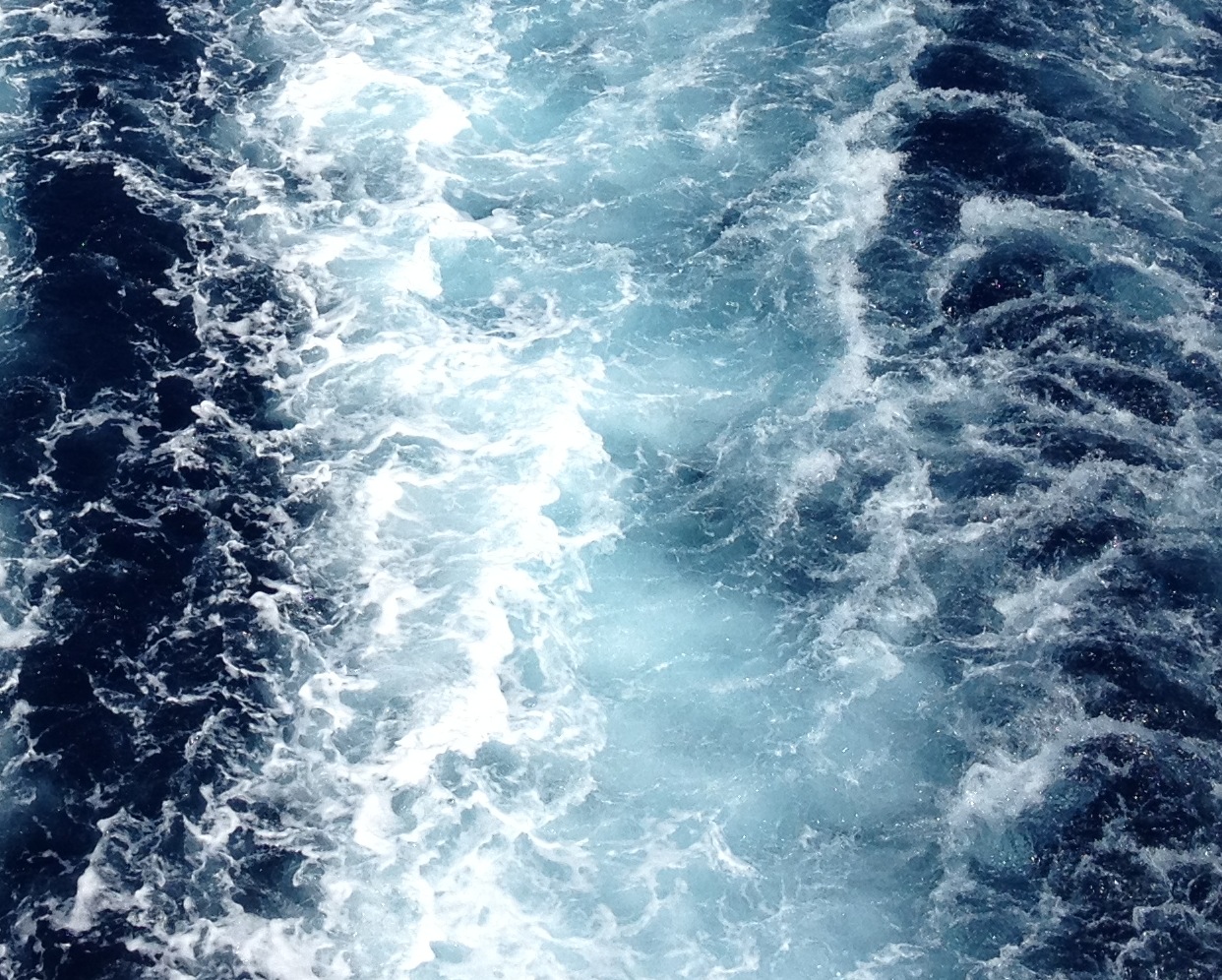 … davon, auf dem Schiff die dunklen, aufgewühlten, tobenden Wassermassen hinter mir zu lassen und mit Blick nach vorn auf den ruhigen, glitzernden, hellen Horizont zuzusteuern – mit dem frischen Wind im Haar, der warmen Sonne im Gesicht und einem Lächeln auf den Lippen.